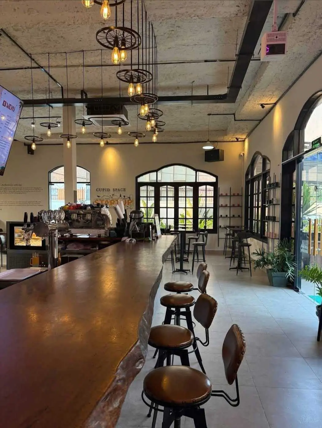 The long, natural-edge wooden countertop adds warmth and character, casual meetings, or solo focus time. Surrounded by industrial-style bar stools and warm ambient lighting from custom pendant fixtures, the space creates a cozy yet professional atmosphere.